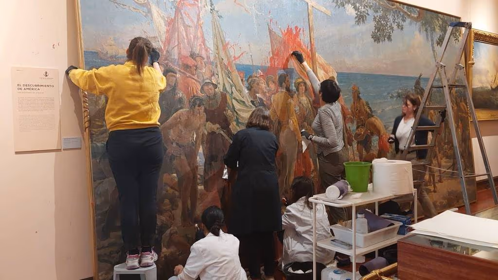 No último domingo, 12, um grupo de “ativistas climáticas” invadiu o Museu Naval de Madrid com o mesmo entusiasmo com que os exploradores que elas detestam teriam invadido Índias, Áfricas e Américas e, num gesto dramático e dramaticamente inútil, as heroínas jogaram tinta vermelha no quadro ‘Primer Homenaje a Colón’, em português, ‘Primeira homenagem a Colombo’, de José Garnelo y Alda, de 1892.