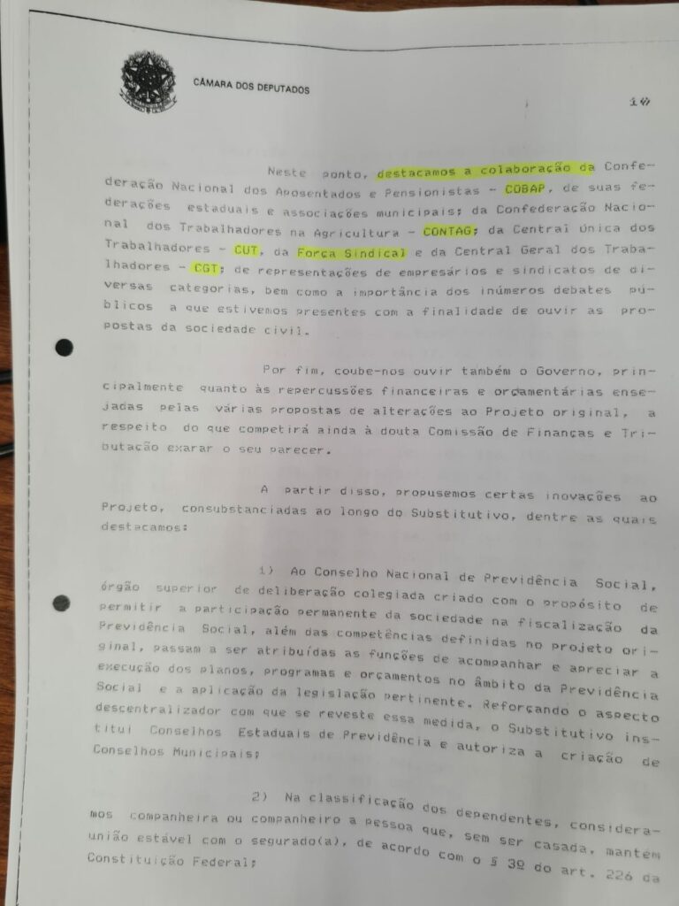 No parecer, Alckmin agradeceu as “colaborações” da Confederação Nacional dos Aposentados e Pensionistas (Cobap), da Confederação Nacional dos Trabalhadores na Agricultura (Contag), da Central Única dos Trabalhadores (CUT), da Força Sindical e da Central Geral dos Trabalhadores (CGT).