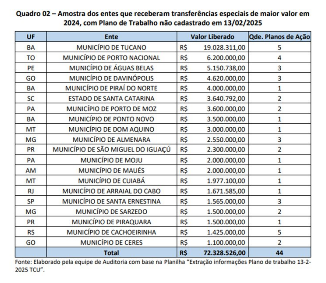 O relatório da CGU traz os resultados de uma auditoria dos planos de trabalho das emendas Pix destinadas a estados e municípios. O documento aponta que, dentre os 20 entes auditados (19 cidades e o estado de Santa Catarina) “em todos os casos foram identificadas deficiências ou irregularidades, de modo que nenhum ente atendeu plenamente ao cumprimento dos requisitos dos planos de trabalho, dentre aqueles inseridos na plataforma Transferegov.br”.
