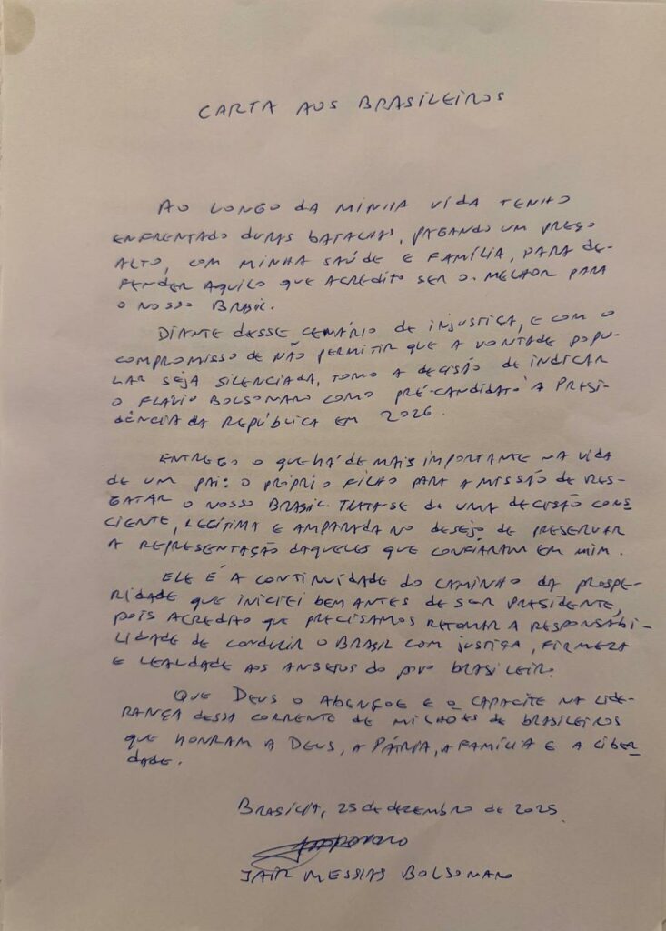 Na carta, escrita de próprio punho, Jair Bolsonaro classifica a decisão como “consciente e legítima”. Na visão do ex-presidente, o Brasil precisa “retomar a responsabilidade de conduzir o Brasil com justiça, firmeza e coragem”, em consonância com “os valores do povo brasileiro” e a candidatura de Flávio seria a “continuidade do caminho da prosperidade que iniciei bem antes de ser Presidente”.