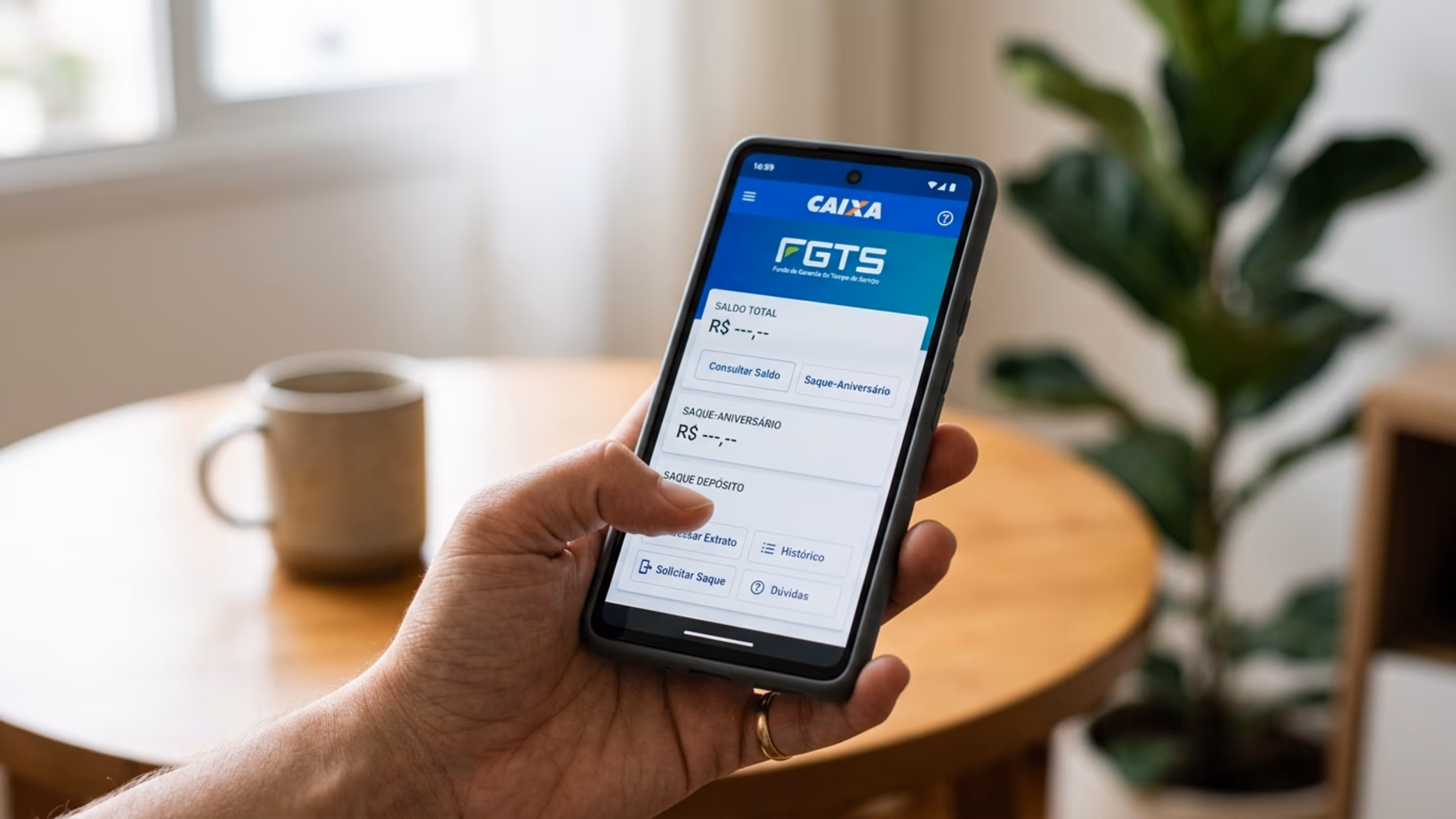 A forma mais prática é verificar o saldo do FGTS pelo aplicativo oficial, onde aparecem contas ativas, contas antigas, valores disponíveis e opções de solicitação. Essa consulta ajuda a entender se existe dinheiro parado e se há alguma modalidade de saque aberta.