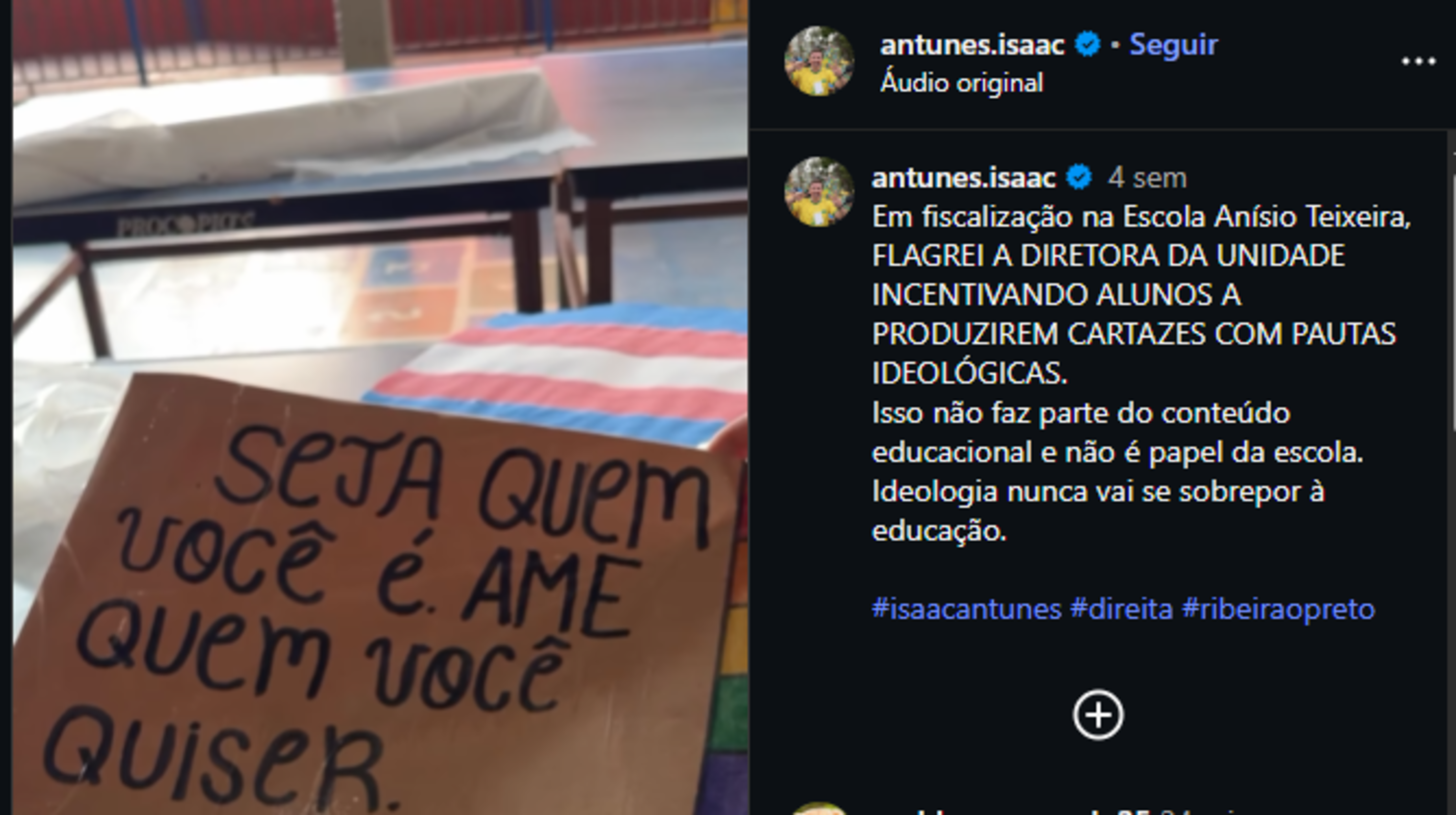 Em vídeo divulgado nas redes sociais, que ultrapassa três milhões de visualizações, Antunes aparece exibindo cartazes com pautas ideológicas dentro da unidade escolar que, segundo ele, teriam sido incentivadas pela direção da escola.