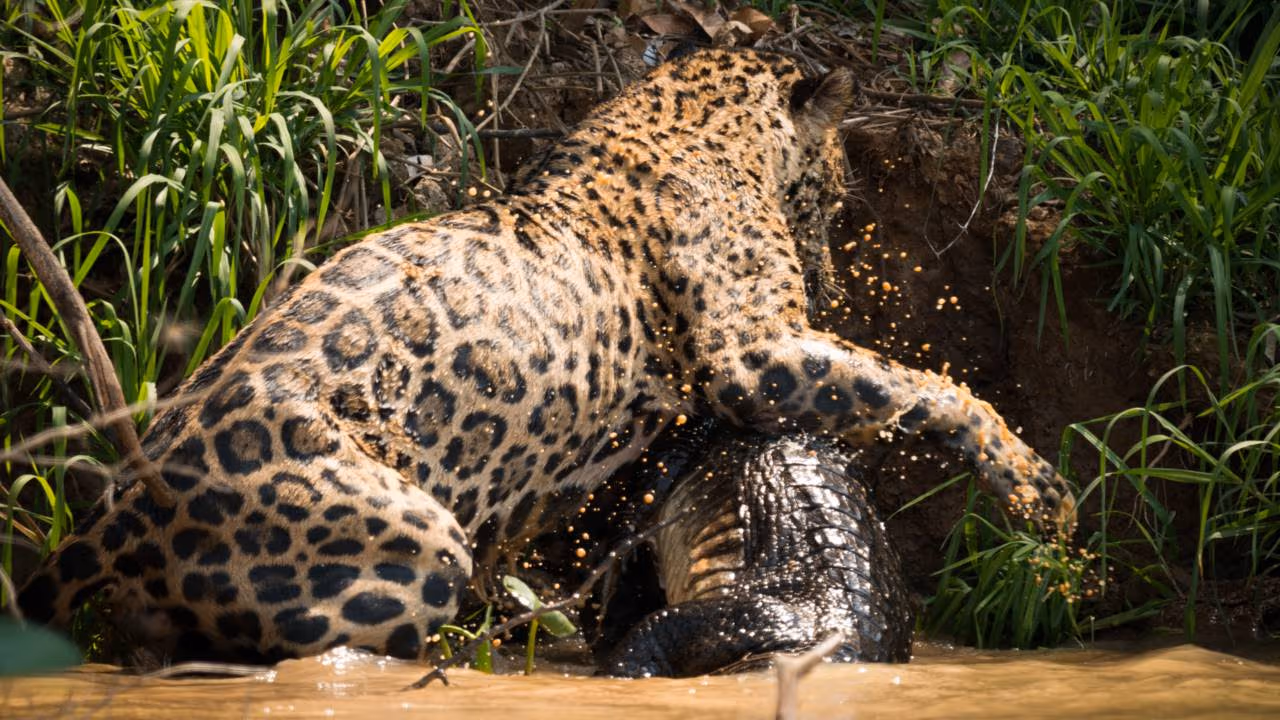 A caçada de onça-pintada a jacarés envolve estratégia e observação cuidadosa do ambiente, em terra firme e na água.