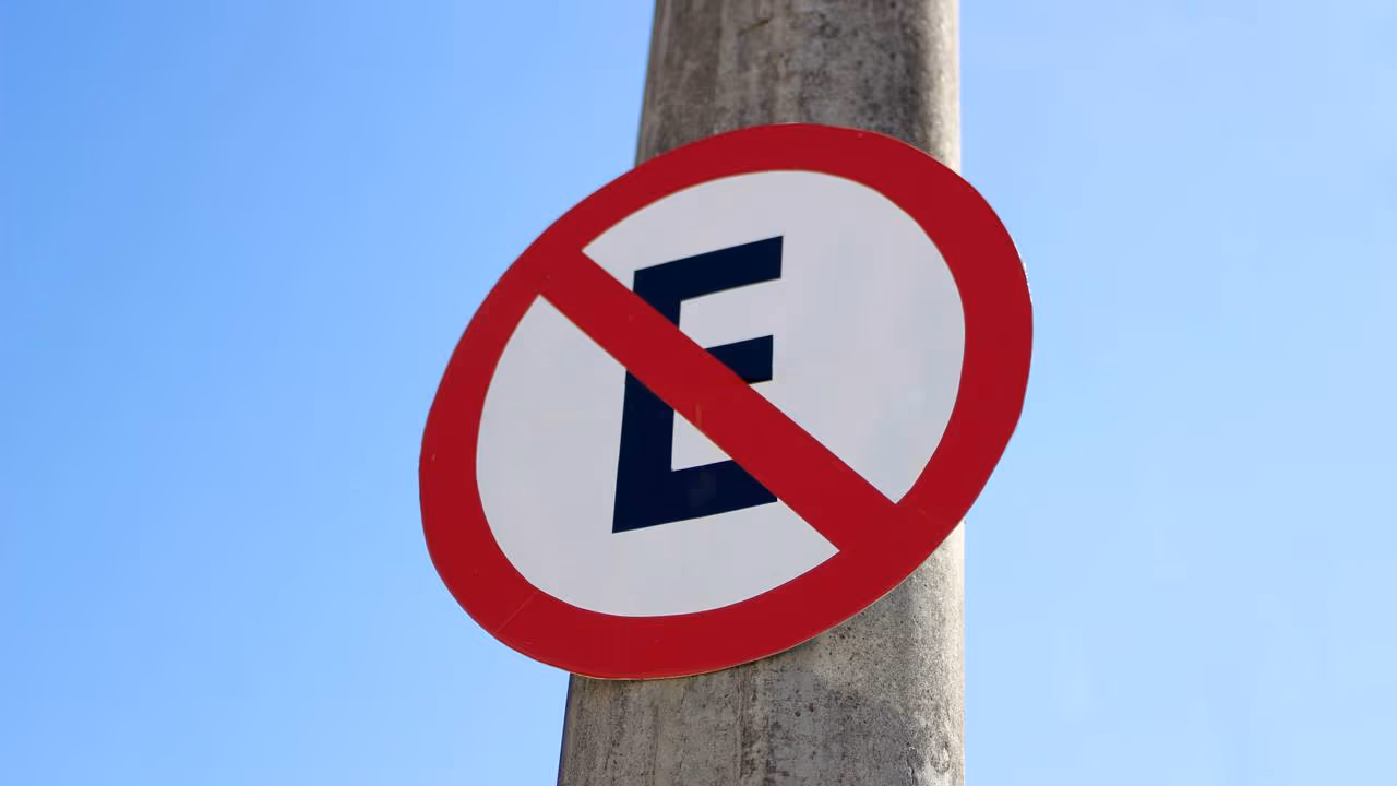 A placa de proibido estacionar faz parte da sinalização de regulamentação e é representada por um círculo vermelho com a letra “E” cortada por uma faixa diagonal. Ela indica que o veículo não pode permanecer parado por tempo superior ao necessário para embarque e desembarque rápido de passageiros, salvo exceções previstas.