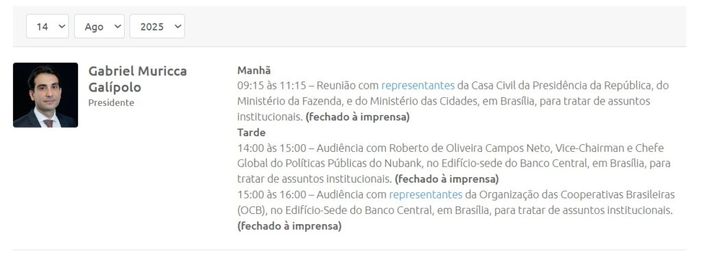 Outro ponto que chama a atenção é que Galípolo, em 14 de agosto, teve uma agenda cheia: entre 9h15 e 11h15 ele teve uma reunião com representantes da Casa Civil da Presidência da República, do Ministério da Fazenda, e do Ministério das Cidades, em Brasília, para tratar de assuntos institucionais. Pela tarde, entre 14h e 15h, o executivo teve audiência com Roberto de Oliveira Campos Neto para tratar de assuntos institucionais. Em seguida, entre 15h e 16h, a audiência foi com representantes da Organização das Cooperativas Brasileiras (OCB).