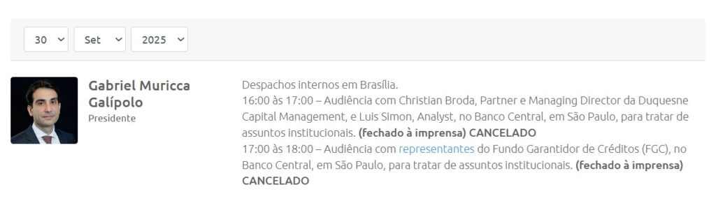 Já em 30 de setembro, Galípolo começou o dia com despachos internos e, pela tarde, teria duas audiências que foram canceladas.