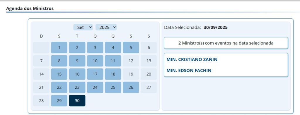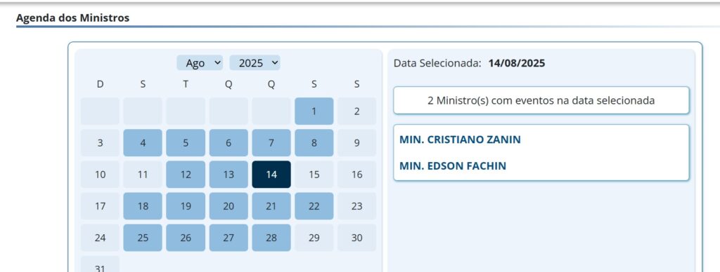 Nas agendas oficiais, tanto em 14 de agosto quanto em 30 de setembro não há qualquer menção sobre as atividades do magistrado