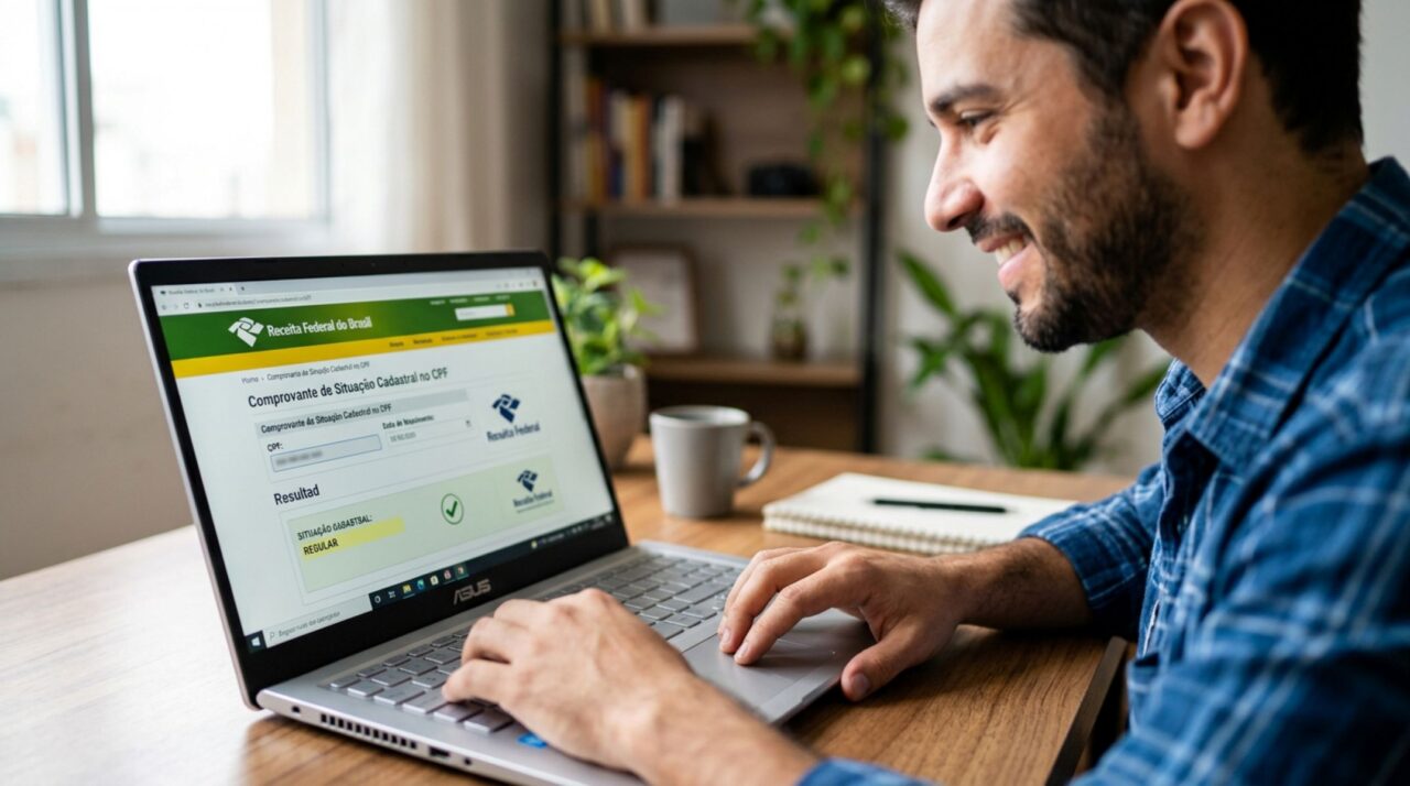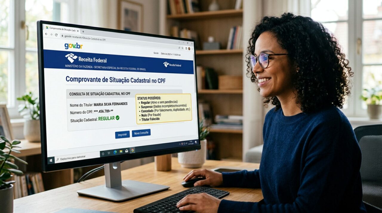 A forma mais rápida é acessar o Comprovante de Situação Cadastral no CPF, serviço público disponível 24 horas no site da Receita Federal. Basta informar o número do CPF e a data de nascimento para obter o resultado imediato, sem cadastro e sem custo algum.