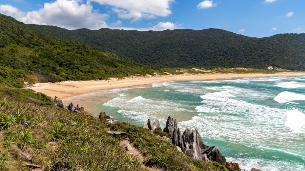 Cercada por morros e florestas nativas, a Praia do Rosa é uma baía em formato de meia-lua conhecida por seus pontos de surfe e observação sazonal de baleias.