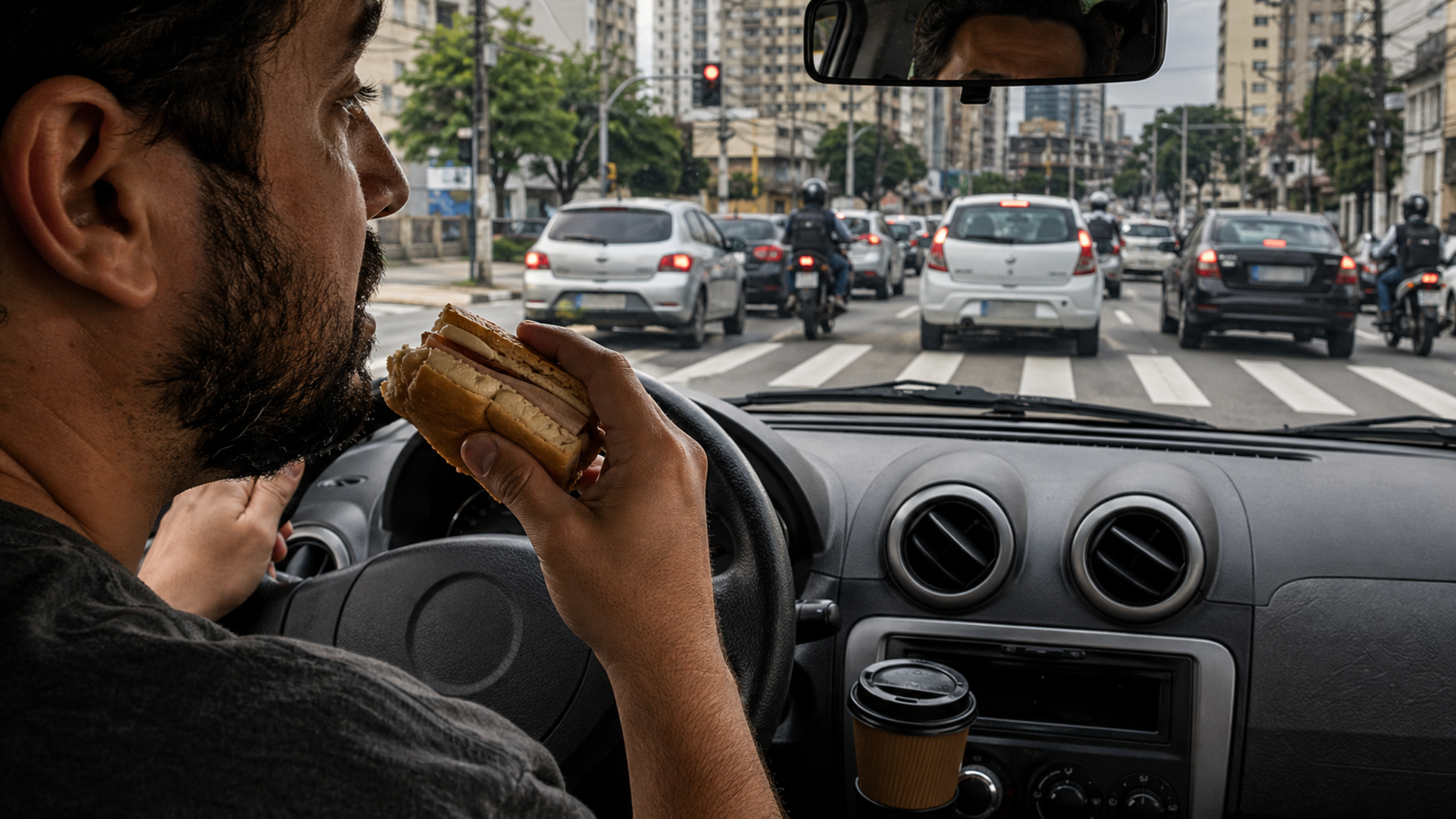 O ponto central está no comportamento do motorista. Ao comer, é comum tirar uma mão do volante, olhar para a embalagem, limpar algo que caiu ou tentar equilibrar bebida e comida ao mesmo tempo. Essa sequência reduz o tempo de reação diante de uma freada brusca ou mudança repentina no trânsito.