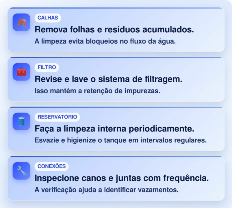 Depois, a água deve seguir para um reservatório tampado, protegido de insetos, sujeira nova e luz direta. Para manter o sistema eficiente e seguro, alguns cuidados de manutenção periódica são fundamentais: