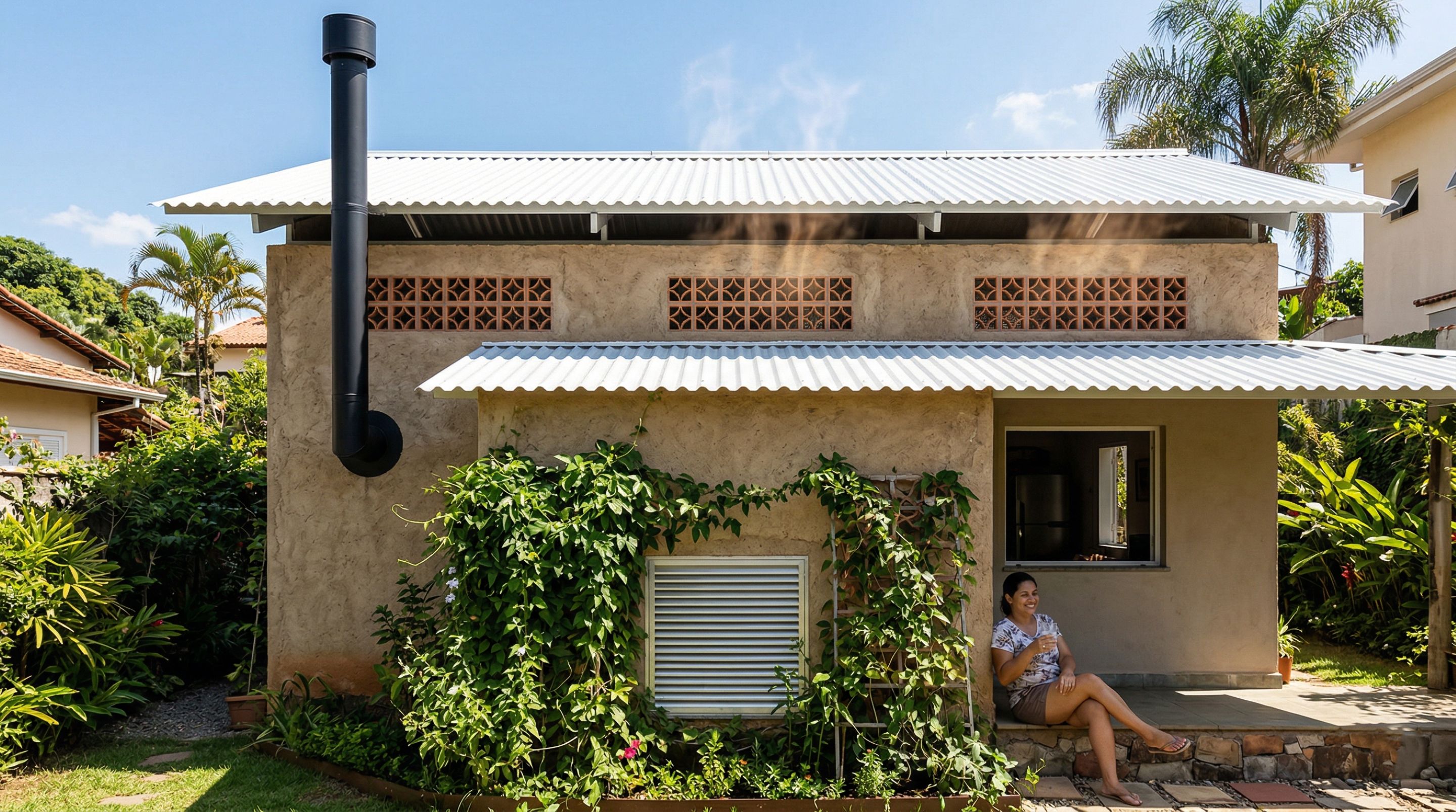 Uma casa é um sistema que pode “respirar”, não apenas quatro paredes e um telhado. No exemplo, a construção de bloco de cimento com telhado de zinco, comum e muito quente, é ajustada sem grandes demolições.