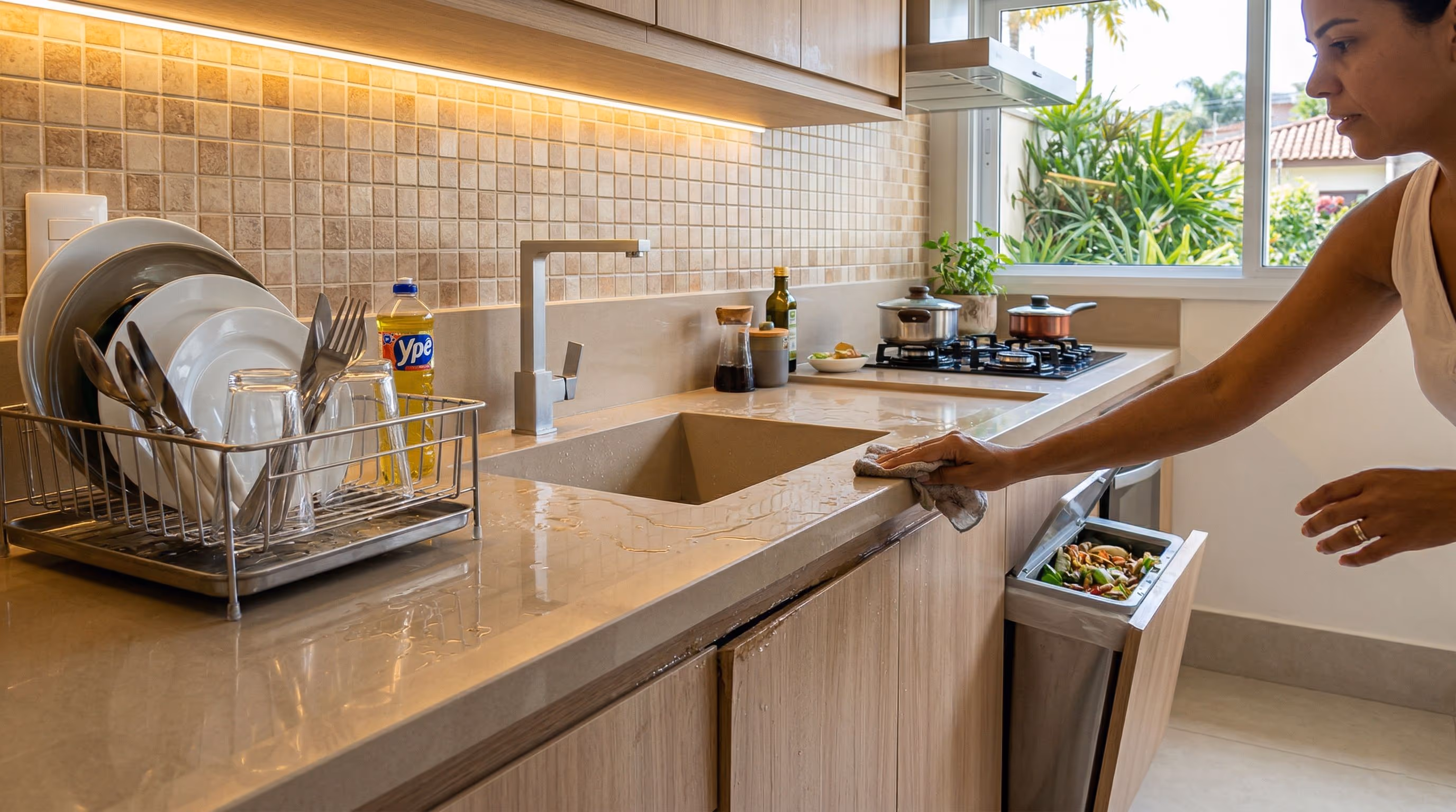 Uma opção mais eficiente é usar lixeiras internas nos gabinetes, com tampa vedada e baldes removíveis. Elas aumentam a capacidade, ajudam a conter odores, mantêm a bancada livre e tornam a organização da cozinha muito mais funcional.