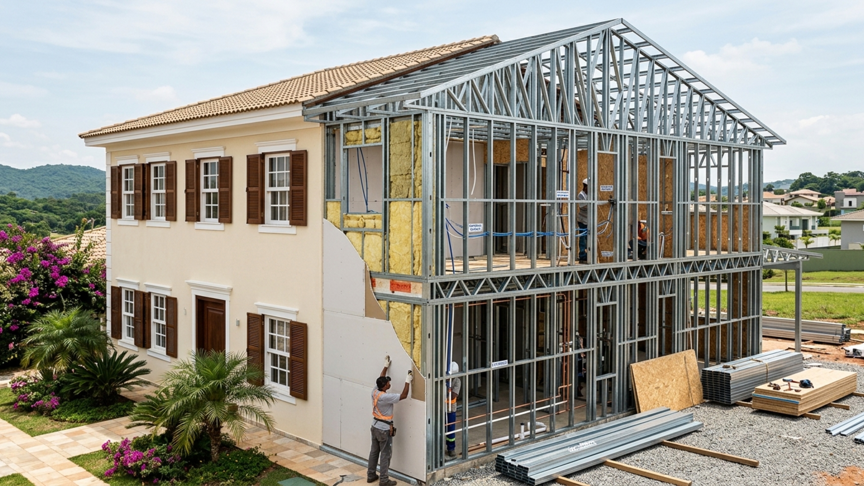 Entenda como a casa sem tijolos usa aço leve, montagem seca e isolamento interno para transformar a obra e ganhar praticidade real