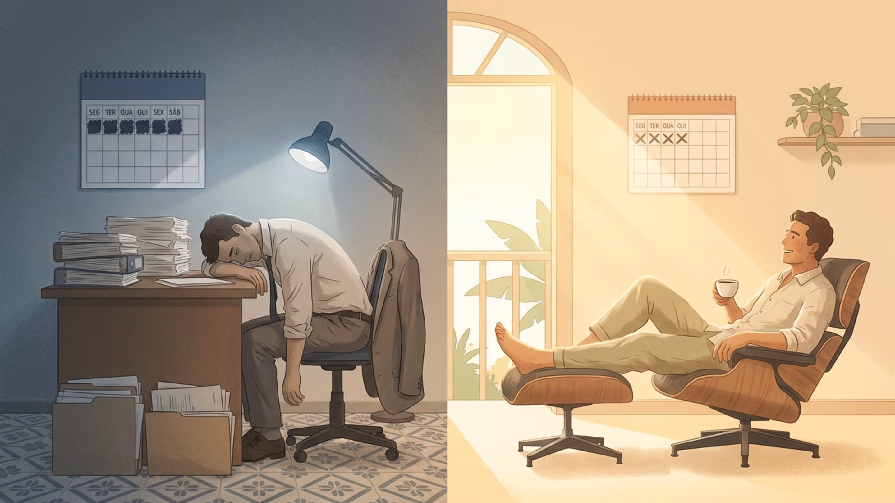 Nesse cenário, a jornada semanal cai de forma mais intensa e pode permitir, em muitos casos, uma organização com quatro dias de trabalho e três de descanso.