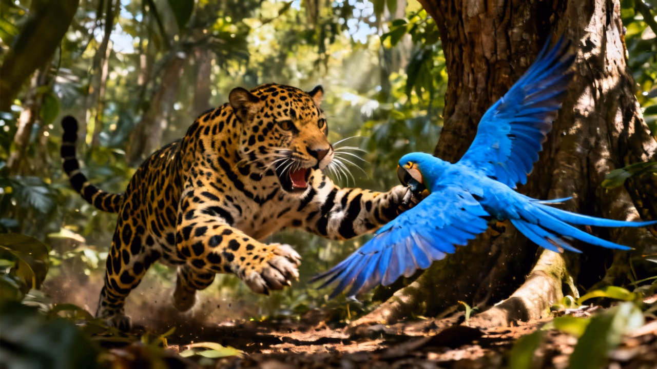 interação predatória entre essas jaguatiricas e a arara azul oferece uma visão intrigante da cadeia alimentar selvagem.