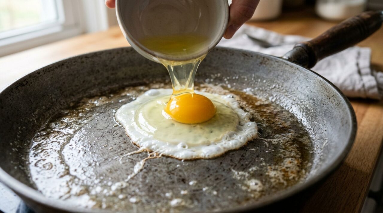- Despeje o ovo com cuidado sobre a gordura já quente e não mexa. O movimento rompe a clara antes de ela selar e aumenta a aderência ao fundo.