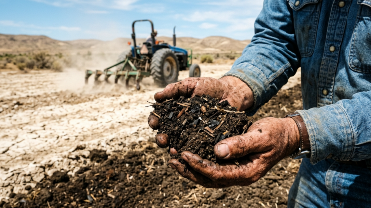 Para romper o solo duro de caliche e aumentar sua capacidade de retenção, usam-se trator com escarificador e uma combinação de insumos como hidrogel, húmus de minhoca, esterco de cavalo e biocarvão “carregado” com nutrientes. Assim, o solo deixa de ser apenas suporte mineral e passa a funcionar como uma esponja biológica cheia de vida.