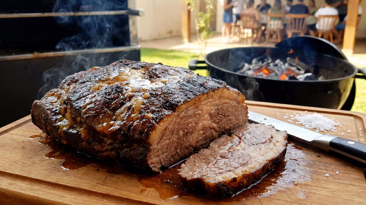Quando assado lentamente, a gordura derrete aos poucos e irriga a carne por dentro. O resultado é uma carne macia, suculenta e cheia de sabor, muito diferente da aparência rígida que ele mostra cru.