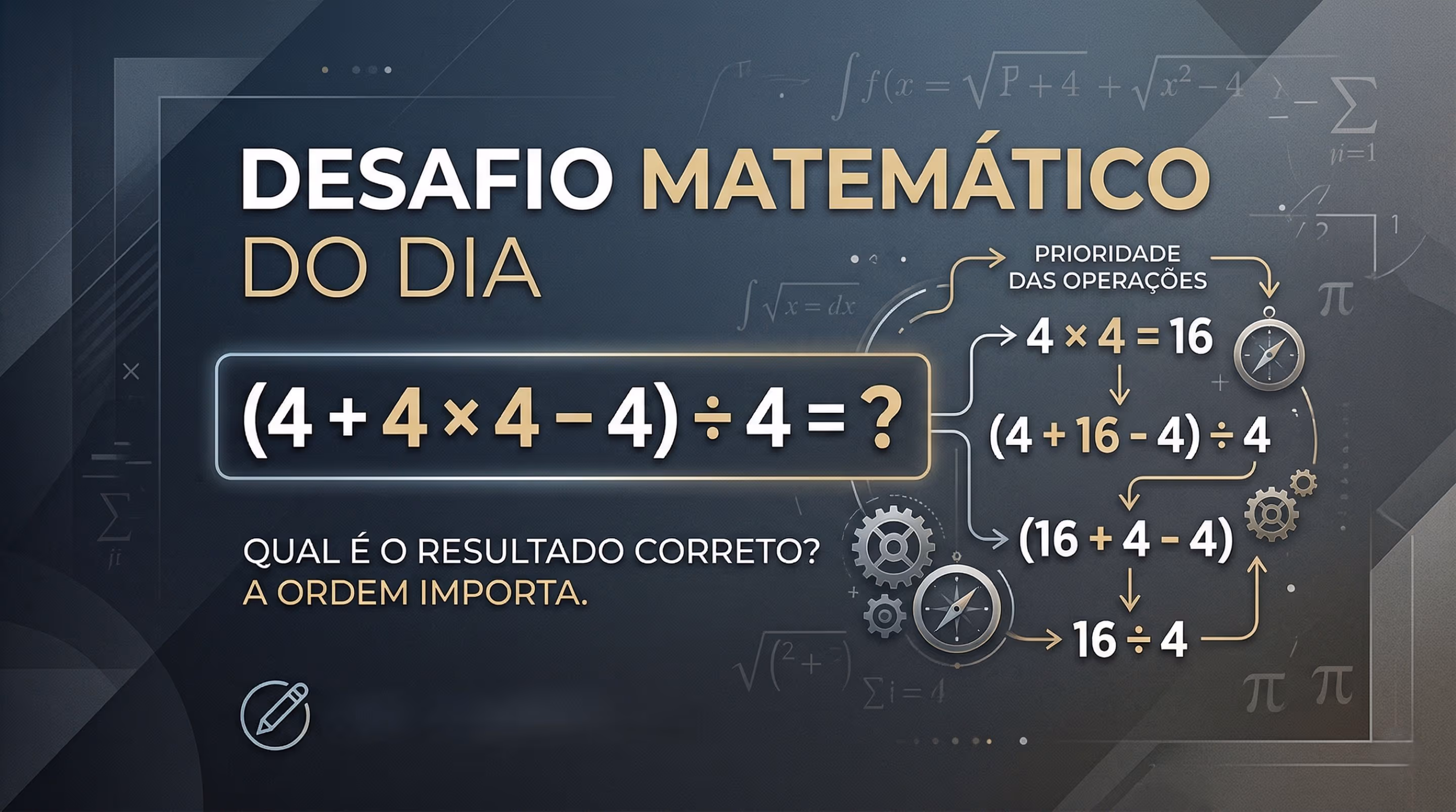A expressão numérica (4 + 4 × 4 – 4) ÷ 4 = ? costuma gerar dúvidas porque exige atenção à ordem das operações e ao uso de parênteses, algo muito presente em desafios de matemática, provas e situações cotidianas que envolvem organização de cálculos.