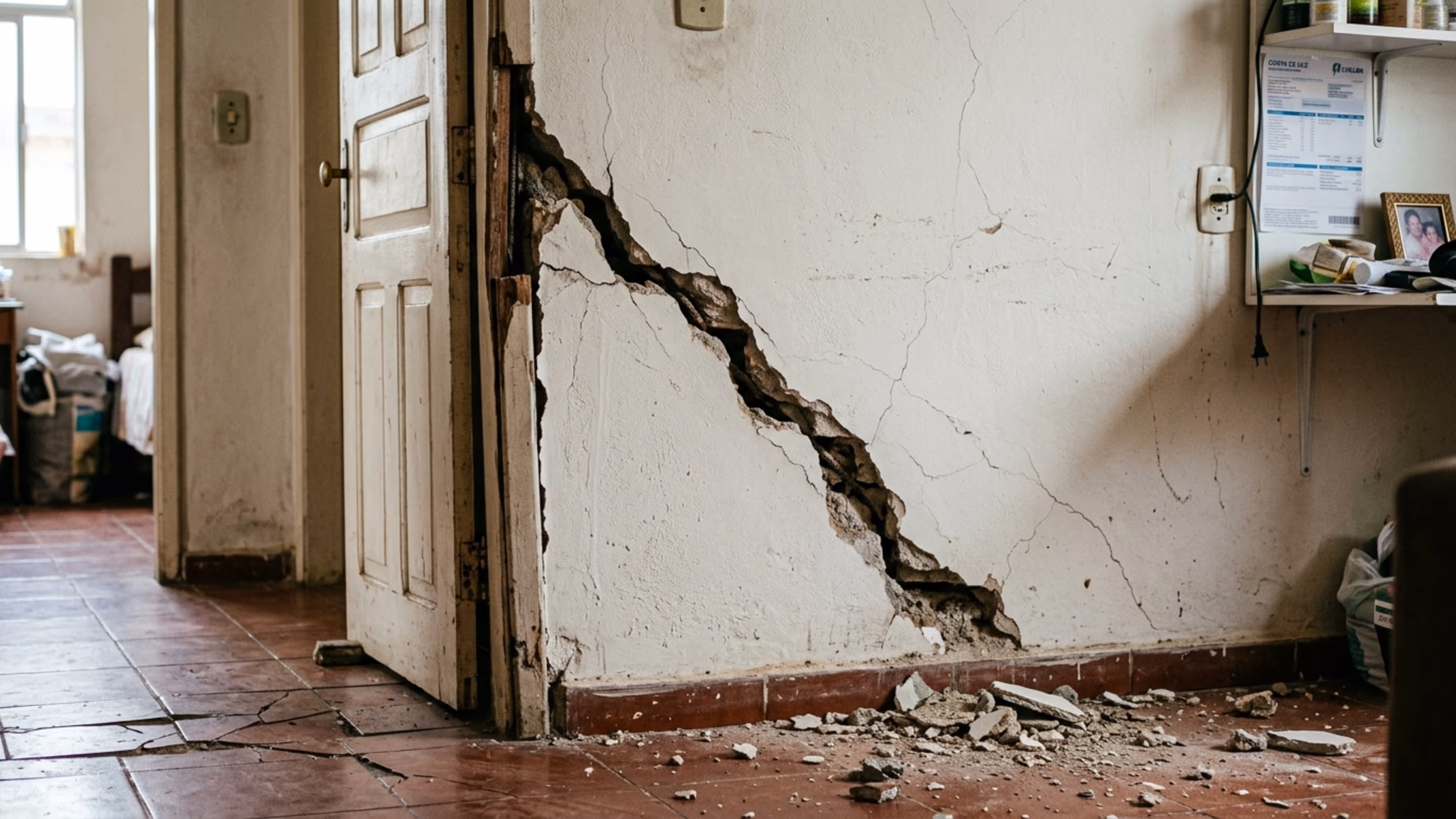 Quando a rachadura diagonal é larga, recente e acompanhada de estalos, deformações ou movimentação perceptível, a prioridade passa a ser a segurança das pessoas. Se houver queda de reboco, portas repentinamente travadas, esquadrias tortas, teto com flecha visível ou sensação de que o piso cedeu, permanecer no imóvel pode ampliar o risco de acidente grave.