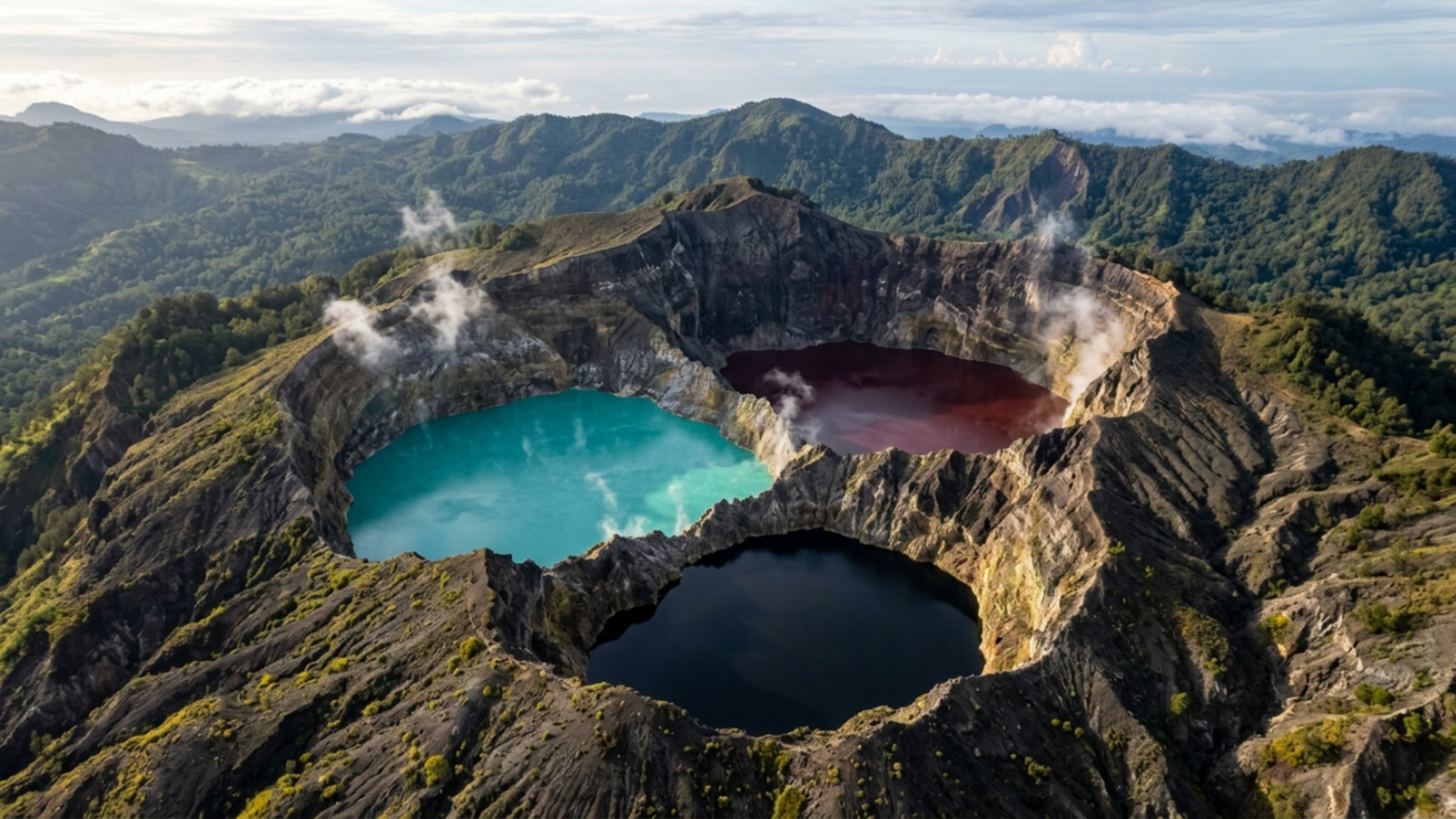 No vulcão Kelimutu, na Indonésia, três lagos de cratera mudam de cor com o tempo por causa de sistemas hidrotermais independentes, variando entre tons de verde, azul, vermelho-escuro, marrom ou preto. A liberação contínua de enxofre e metais pesados, somada ao contraste com o terreno seco ao redor, amplia a sensação de cenário irreal.
