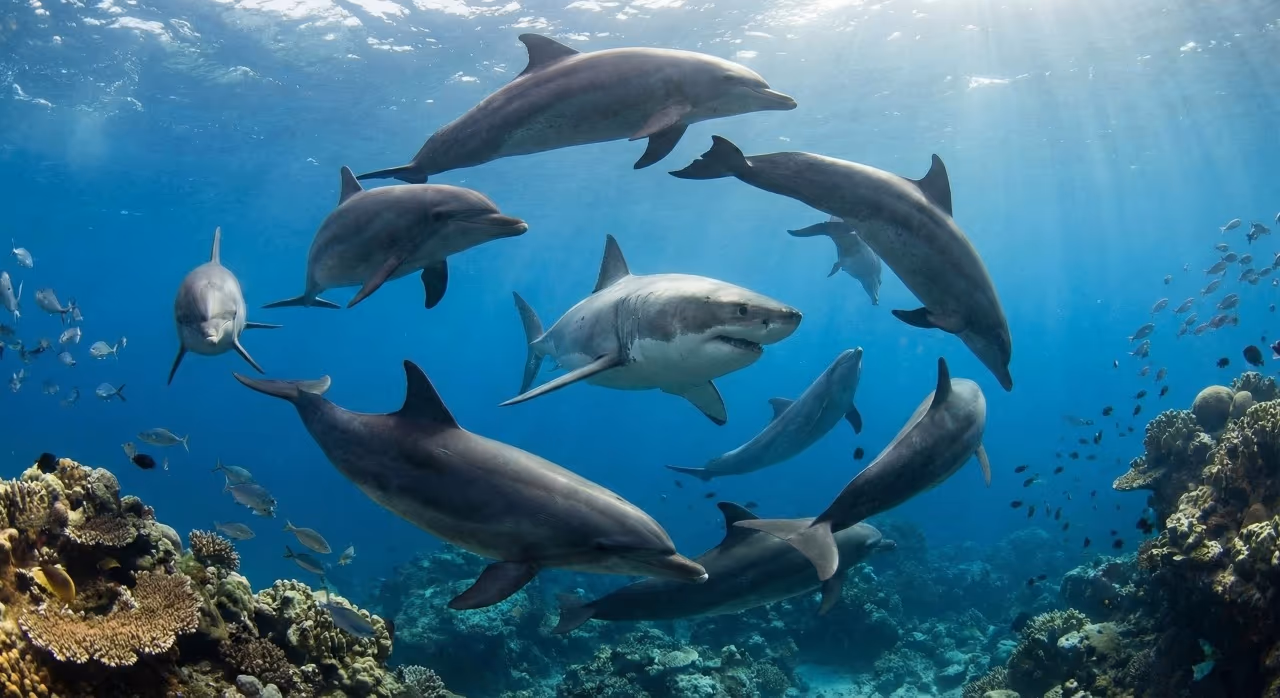 Por que tubarões e golfinhos raramente entram em confronto direto?