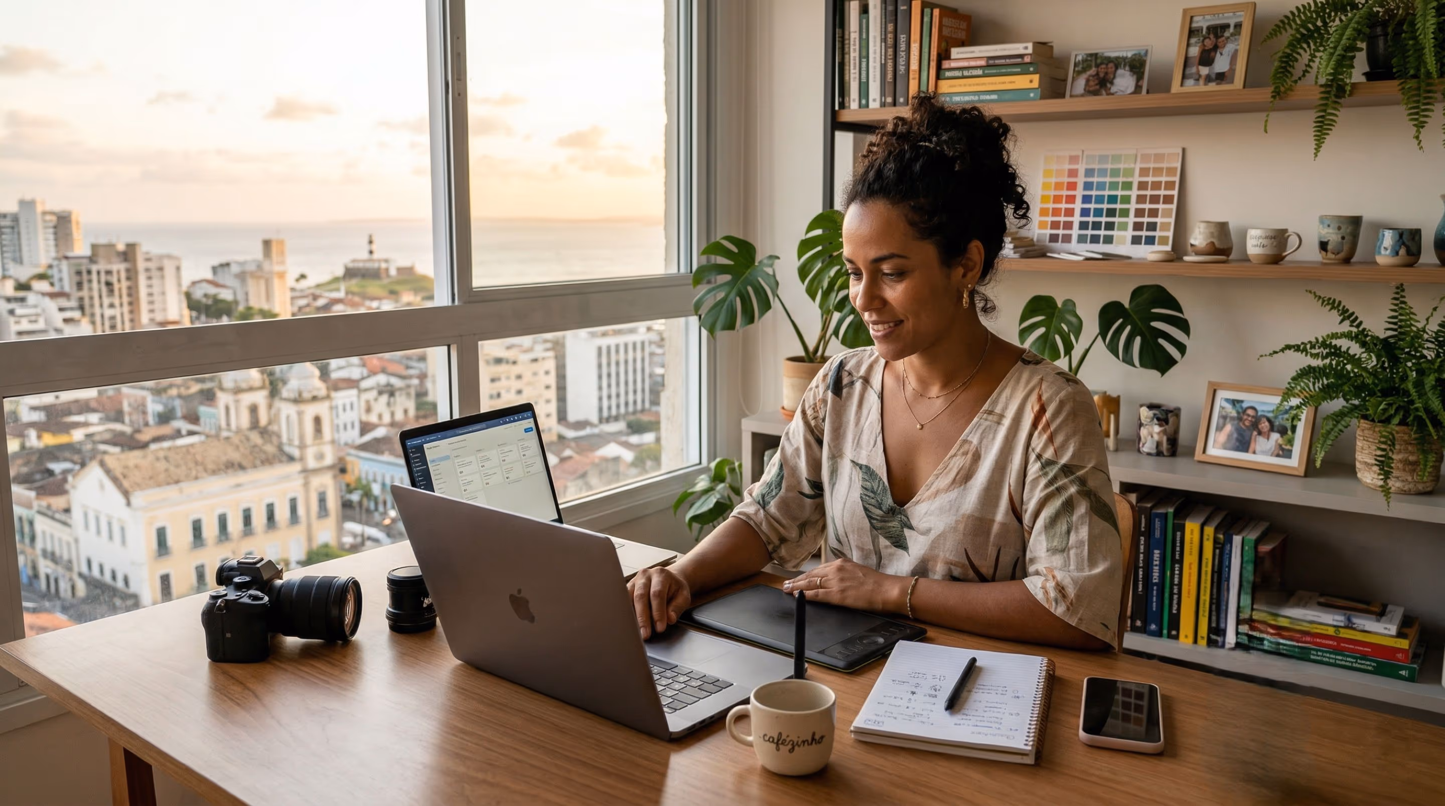 Designer gráfico e web designer trabalham com construção de marcas, interfaces, peças promocionais e presença visual consistente para empresas, autônomos e projetos digitais.