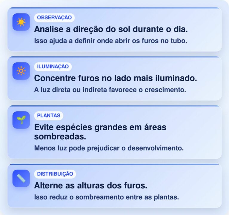 O posicionamento das plantas depende da luz disponível no local de instalação da coluna. Em áreas com sol ou claridade de todos os lados, os furos podem ser distribuídos ao redor de todo o tubo, permitindo cultivo em 360 graus e crescimento mais equilibrado das plantas.