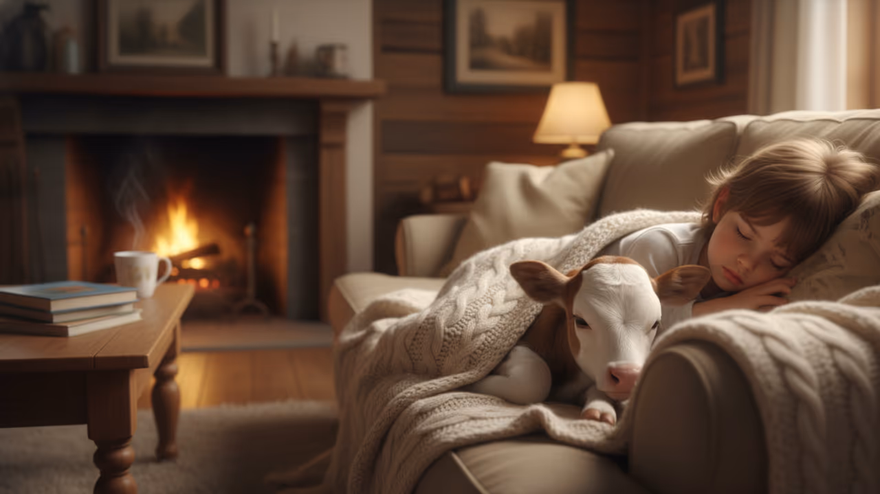 A foto do menino de 3 anos adormecido no sofá ao lado do bezerro recém-resgatado destacou a relação de proximidade típica da vida rural, em que crianças crescem acompanhando nascimentos, tratamentos e rotinas de manejo.