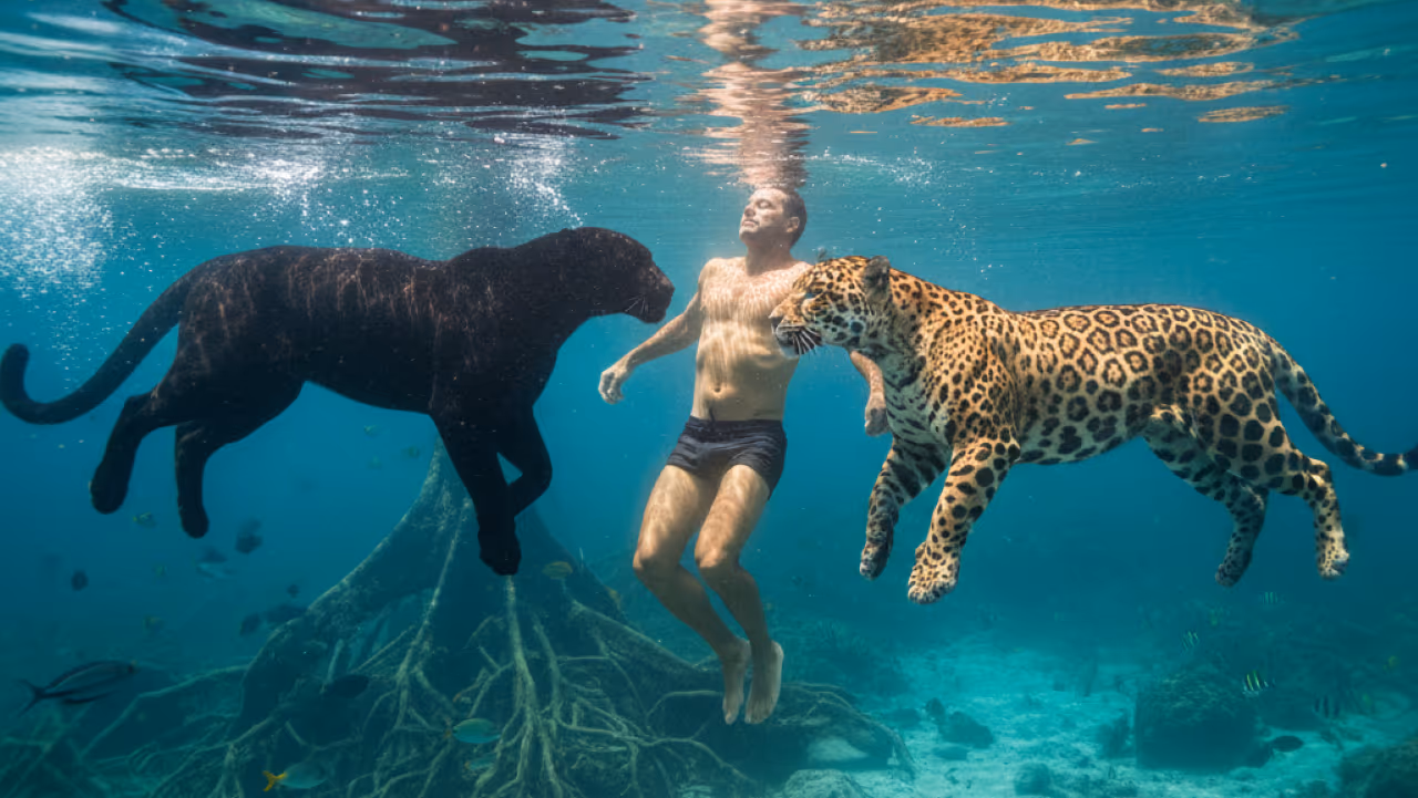 Sob as águas de um rio calmo, um homem se destaca pela sua audácia e conexão incomum com dois dos mais majestosos felinos: uma pantera-negra e uma onça-pintada. Este vídeo único capta momentos que desafiam a lógica e a natureza selvagem desses animais.