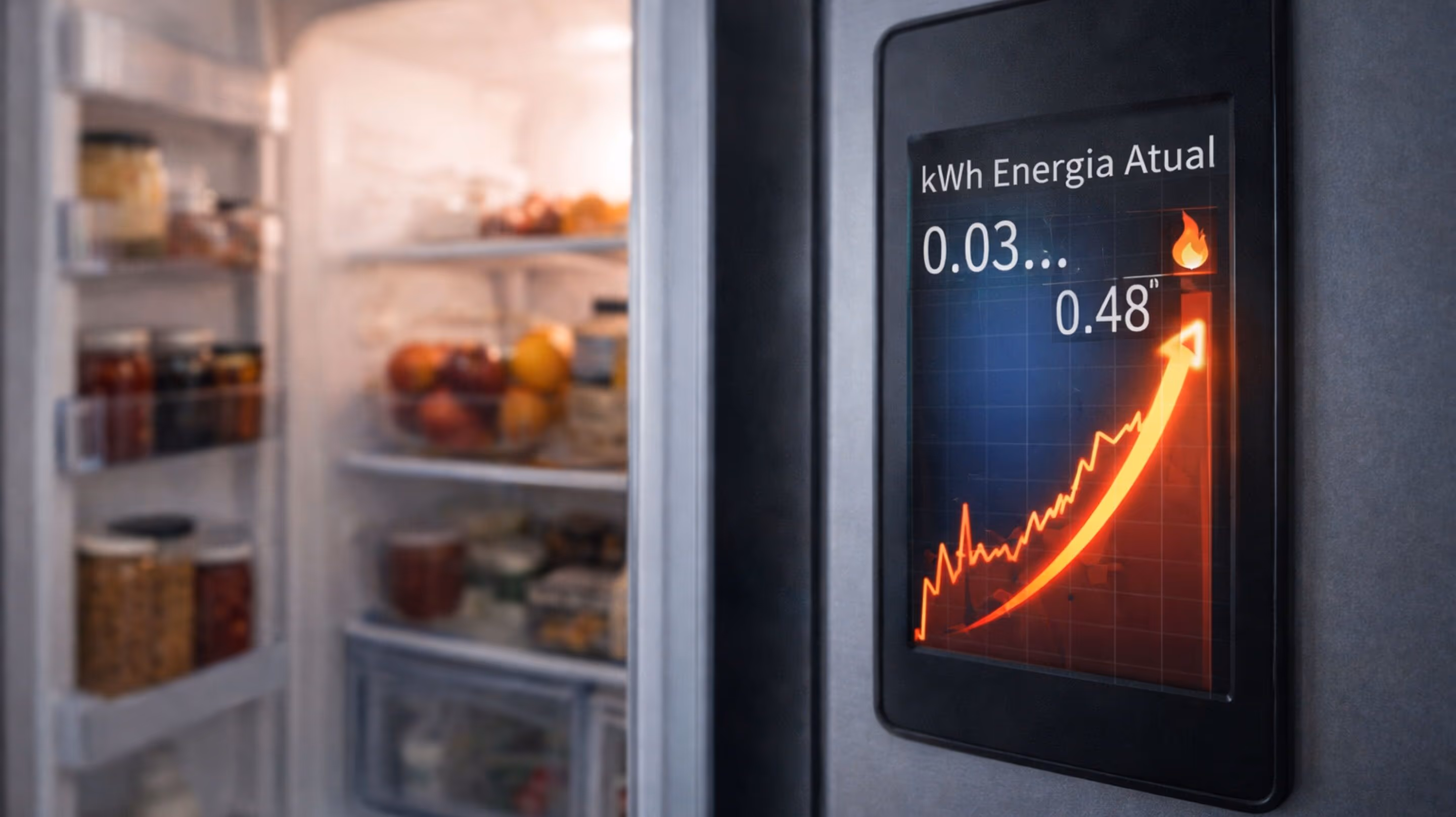 Quando a geladeira é religada após horas desligada, o compressor precisa trabalhar muito mais para resfriar tudo novamente. Isso gera um pico de consumo maior do que o normal.