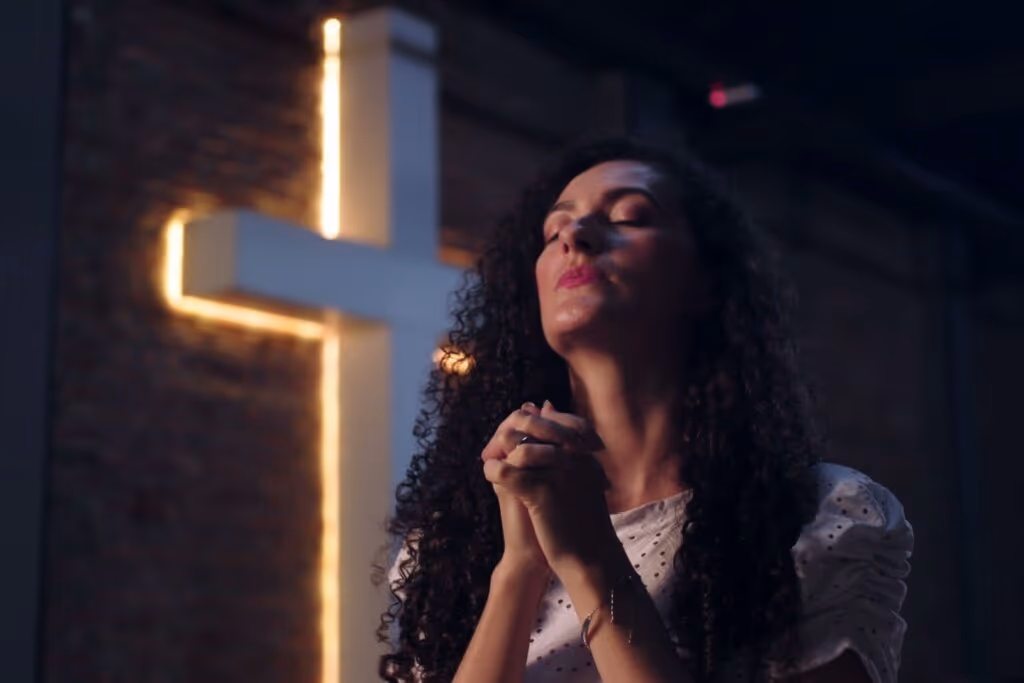 Mulher com os olhos fechados orando em frente a uma cruz branca