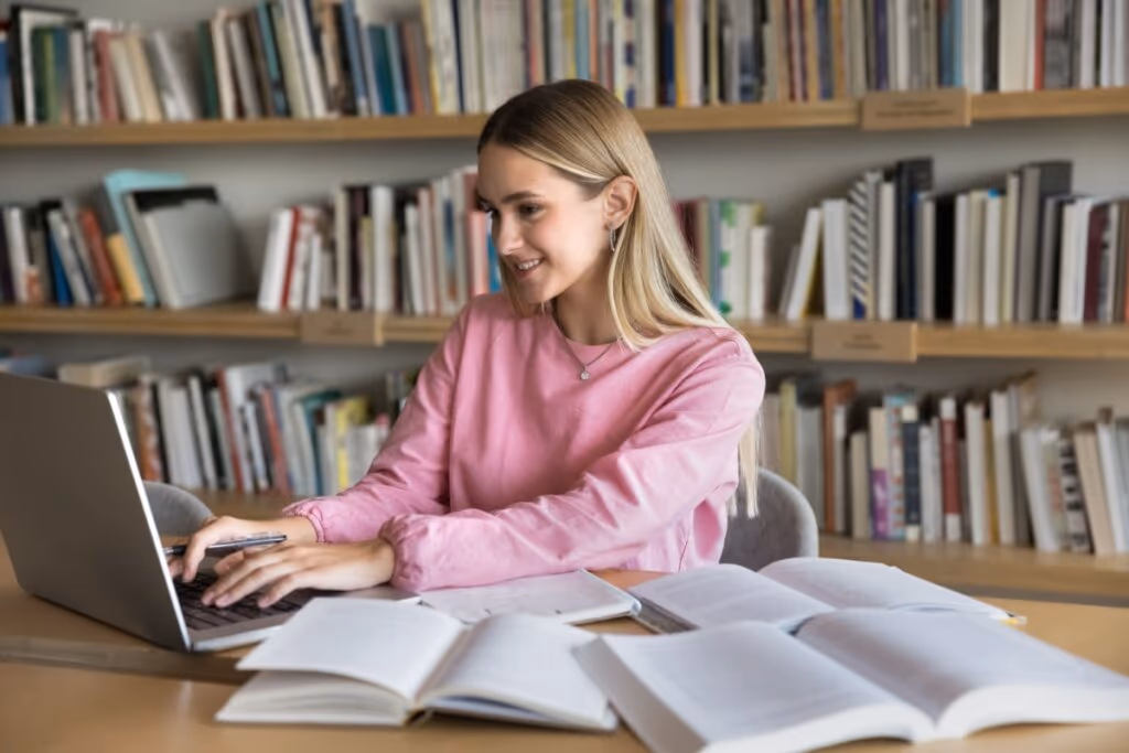Jovem com cabelo liso, loiro e longo, usando camisa de manga longa rosa e com diversos livros abertos em mesa de estudo enquanto mexe no notebook