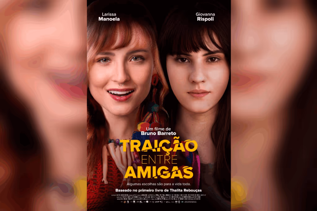 Cartaz do filme “Traição Entre Amigas” com as personagens interpretadas por Larissa Manoela e Giovanna Rispoli em close, exibindo o título em amarelo na parte central