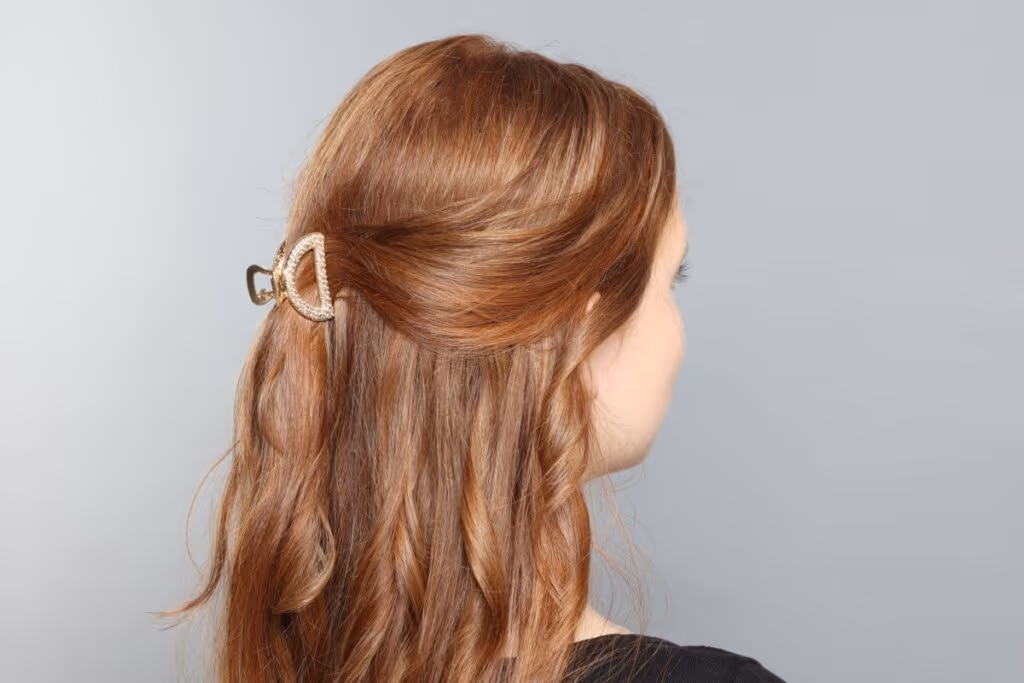 O meio preso é aquele penteado coringa que funciona tanto para o dia a dia quanto para produções mais arrumadas, além de ser uma ótima alternativa para aliviar o calor sem abrir mão do cabelo solto. Para reproduzir, comece separando a parte superior dos fios, desde a altura das têmporas até o topo da cabeça, mantendo o restante do cabelo solto.