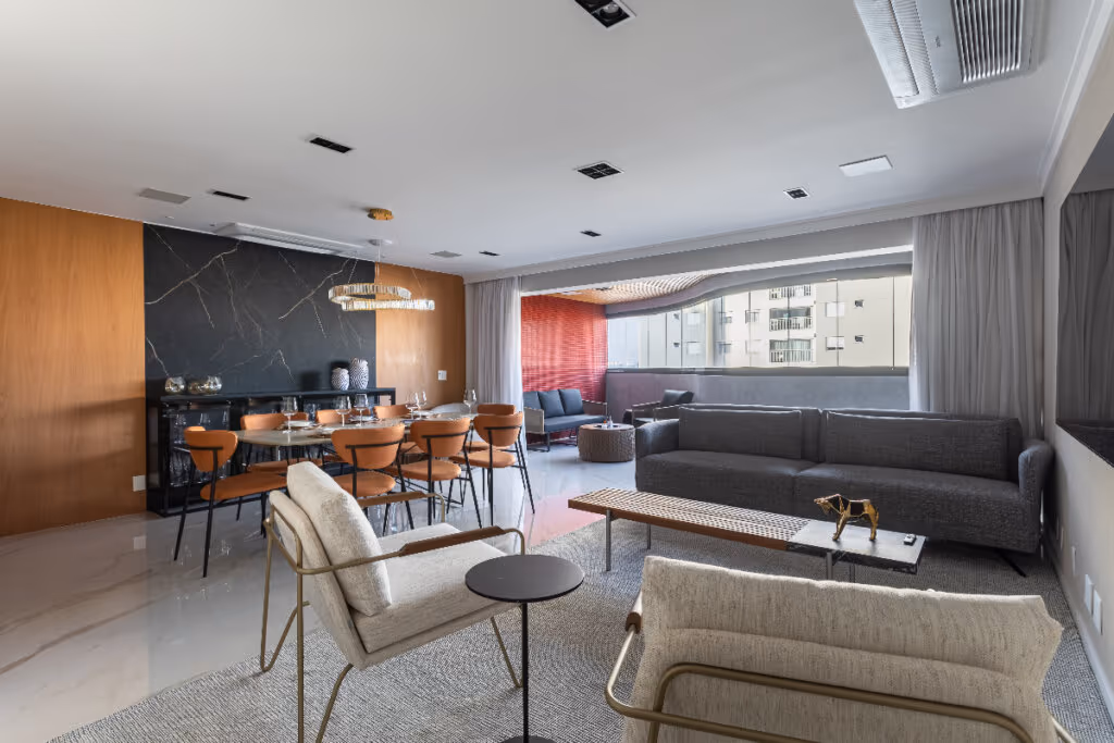 Uma forma elegante de mesclar materiais é reservar cada revestimento para uma função específica. No living, por exemplo, uma parede com mármore pode se tornar o grande destaque do espaço. Já na varanda gourmet, o uso de pastilhas é bem-vindo, especialmente quando escolhidas em tons sobre tons ou em cores que conversem dentro da mesma paleta. Assim, os ambientes dialogam entre si sem perder identidade.