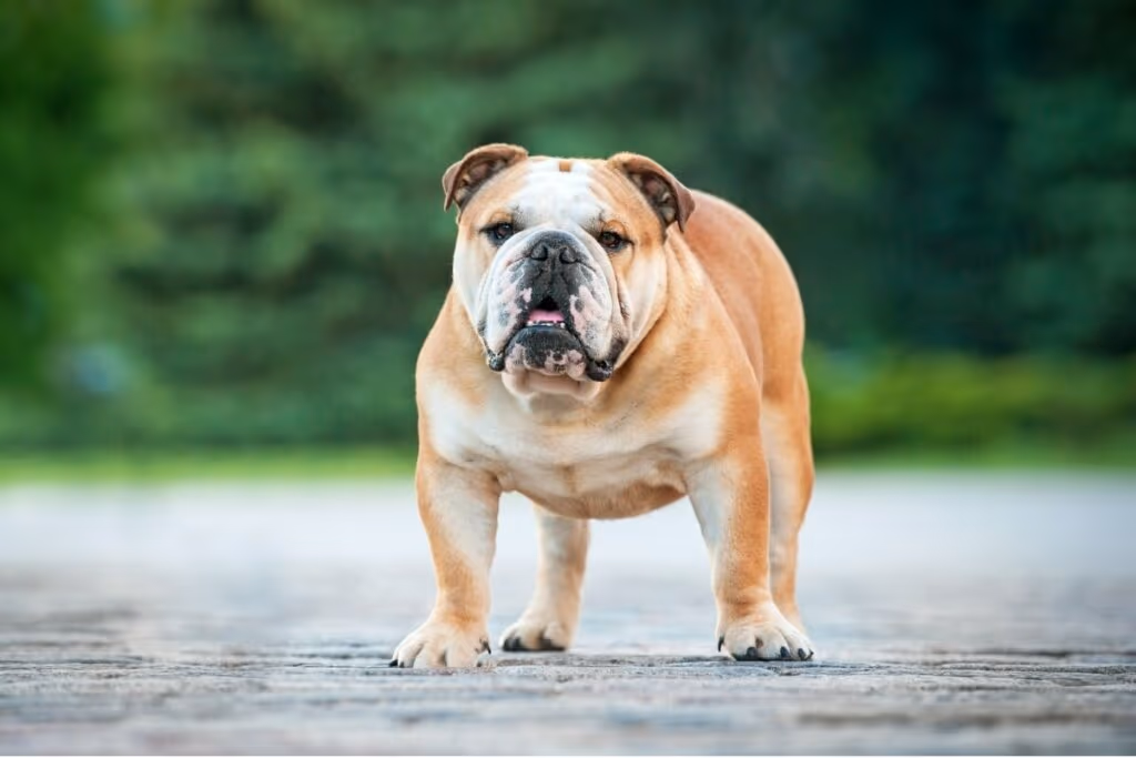 De origem inglesa, o buldogue inglês é um cão de porte médio e musculoso, com uma aparência marcante devido ao focinho achatado, rugas no rosto e mandíbula proeminente. Sua pelagem é curta, lisa e fácil de manter. Apesar do visual sério, é extremamente dócil, calmo e leal aos tutores. Costuma ser pouco exigente em termos de atividade física e prefere ambientes internos e confortáveis.