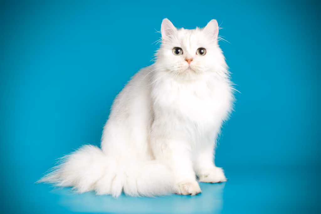 De origem russa, o siberiano é um gato forte, de porte médio a grande, adaptado a regiões frias. A pelagem branca é longa, espessa e impermeável, exigindo escovação regular. É um felino ativo, curioso e muito inteligente, que se adapta bem a diferentes ambientes. Apesar da energia, demonstra carinho e cria laços profundos com o tutor.