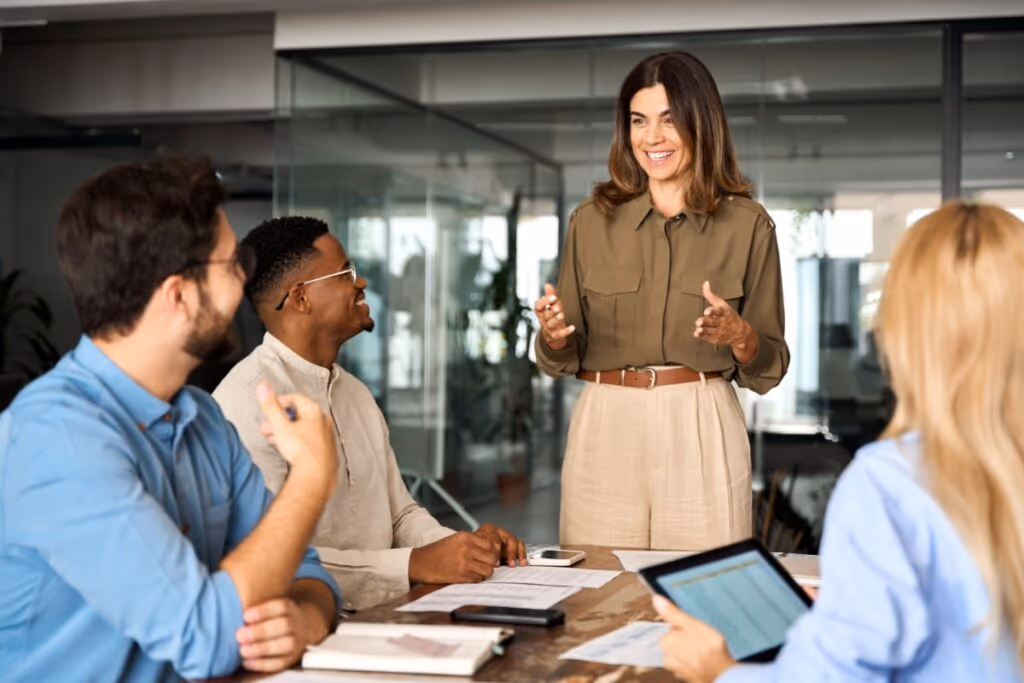 Mulher com cabelo curto liso, usando camisa verde e calça bege liderando reunião de equipe em escritório