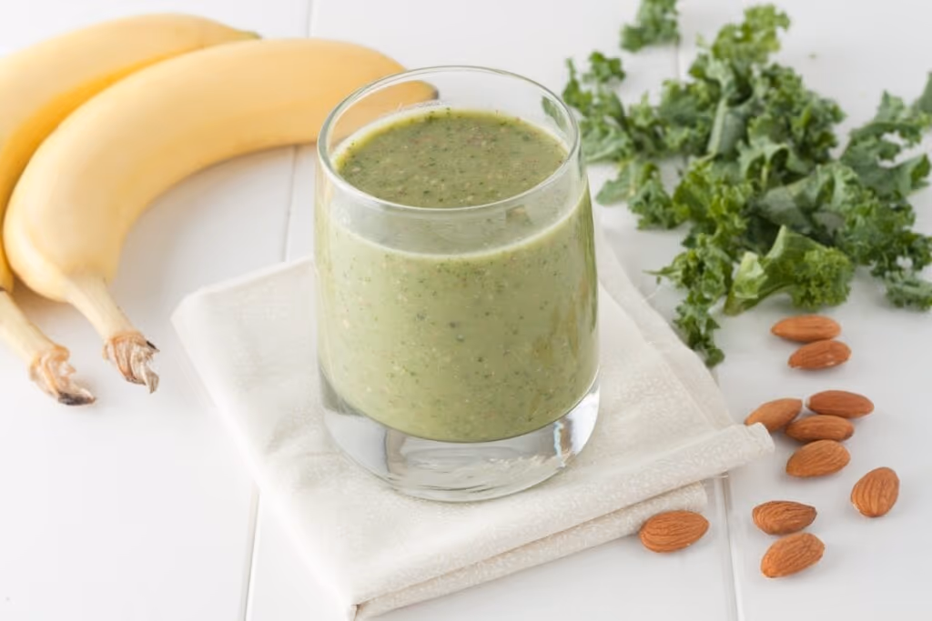Em um liquidificador, coloque as folhas de couve, o leite de amêndoas e a banana e bata até obter uma mistura homogênea. Adicione a farinha de aveia e bata para incorporar. Transfira para um copo e sirva em seguida.