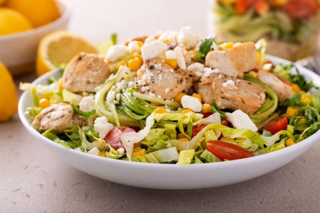 Em uma tigela, monte a base com as folhas de alface. Adicione o tomate-cereja, o milho-verde, o pepino e o queijo esfarelado. Distribua o frango grelhado por cima.