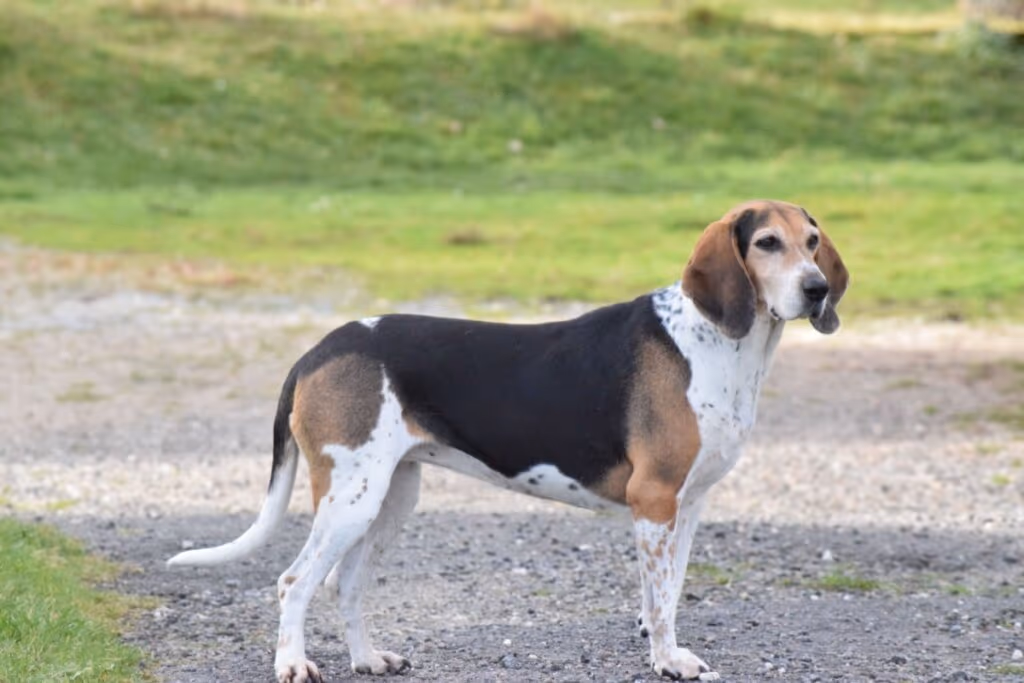 Beagle Harrier, com pelagem branca, preta e marrom, em pé em um parque