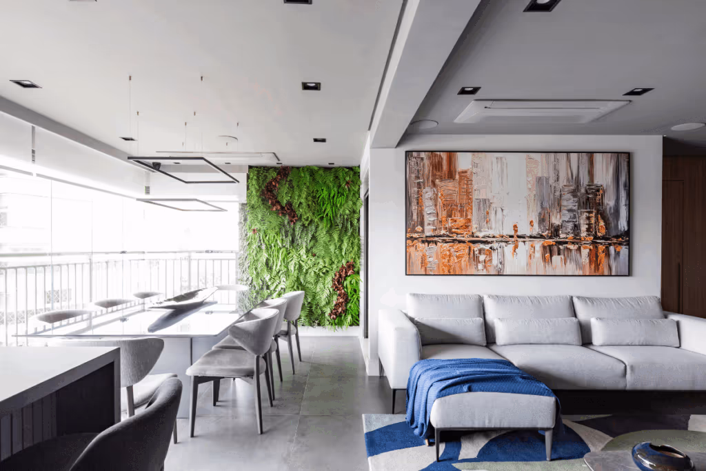 Um dos exemplos mais atemporais da biofilia dentro dos projetos de interiores faz referência à inserção de jardins verticais, que normalmente ocupam um trecho de uma parede e entregam um ponto onde as plantas se tornam protagonistas do ambiente.