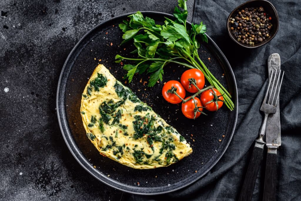 - Café da manhã: omelete de espinafre e queijo. Rica em proteínas, ferro, vitamina B12 e cálcio, é uma opção rápida e nutritiva. Basta bater ovos, adicionar espinafre e queijo branco e preparar na frigideira;