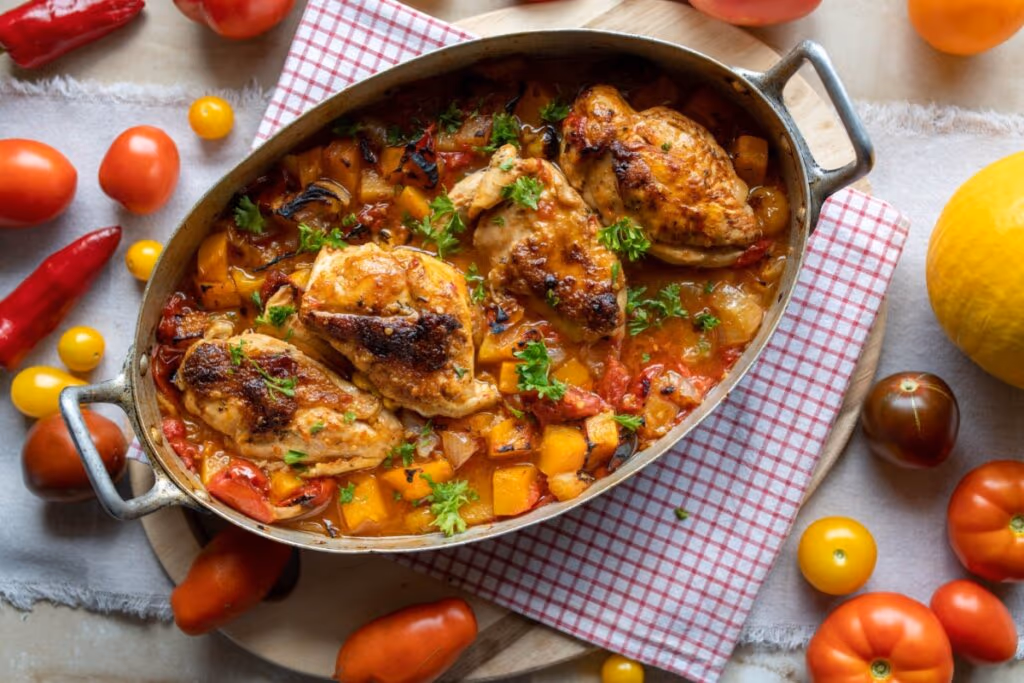 Em uma caçarola grande, aqueça o azeite em fogo médio e adicione a cebola, a abóbora, o pimentão, os tomates, o tomate-cereja e o alho. Refogue por 5 minutos, mexendo de vez em quando. Tempere com sal e pimenta-do-reino. Adicione a água, misture e desligue o fogo. Abra espaço entre os legumes na caçarola e encaixe as peças de frango por cima. Regue com o caldo da frigideira. Leve ao forno preaquecido a 200 °C por 40 minutos. Nos últimos 10 minutos, aumente para 220 °C para dourar. Retire do forno quando o caldo estiver espesso, e os legumes, macios. Salpique a salsa picada por cima. Sirva quente.