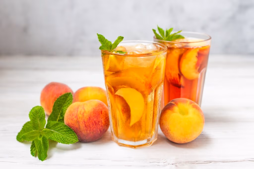 Transfira o pêssego com o caldo para o chá ainda morno, acrescente as folhas de hortelã e o suco de limão e misture delicadamente. Deixe esfriar completamente e leve à geladeira por pelo menos 2 horas para gelar e intensificar o sabor. Sirva em copos altos com bastante gelo, adicionando fatias de pêssego e folhas de hortelã para finalizar.