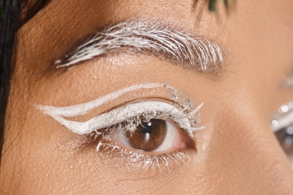 Colorir os cílios com máscara branca ou aplicar o pigmento Cloud Dancer nas pontinhas cria um efeito artístico e delicado. É perfeito para quem gosta de detalhes diferentes sem exagerar.