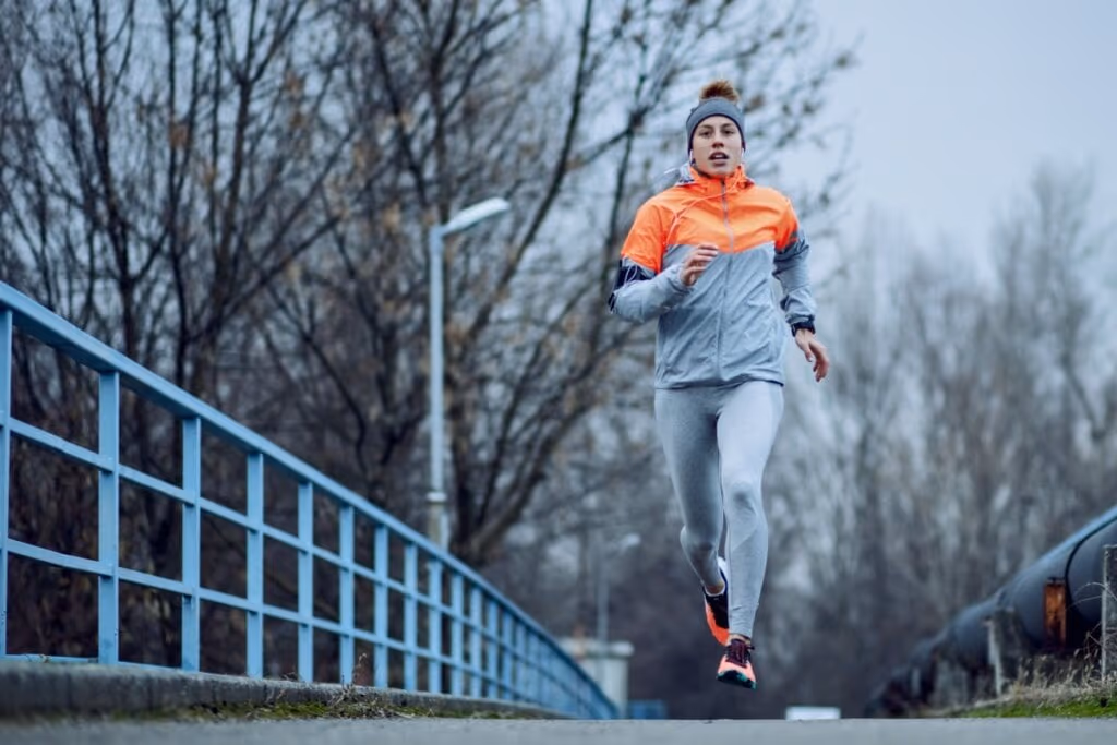 Mulher de roupa cinza correndo em ambiente externo nublado