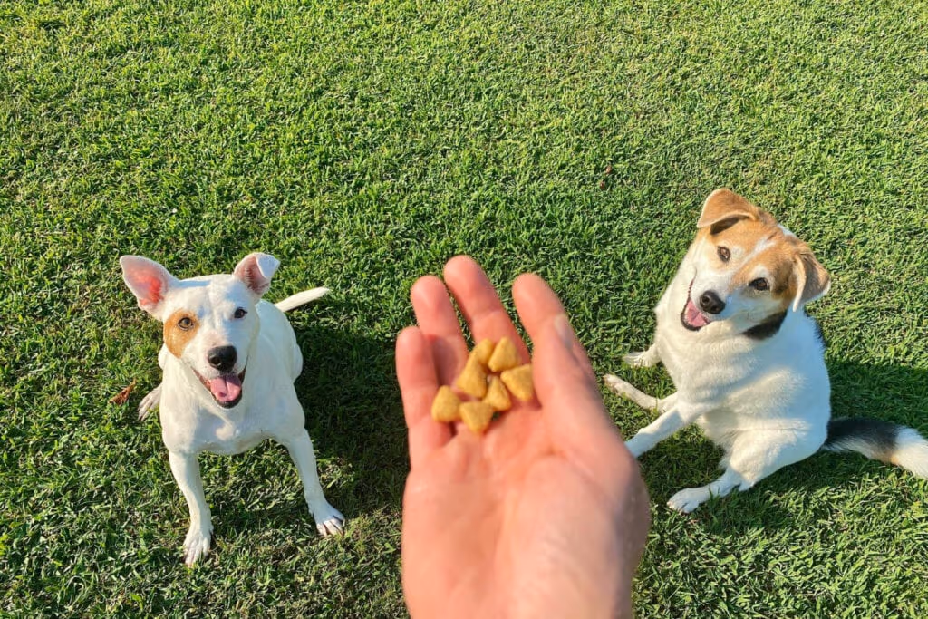 Mão humana com petiscos caninos e dois cachorros sentados na grama